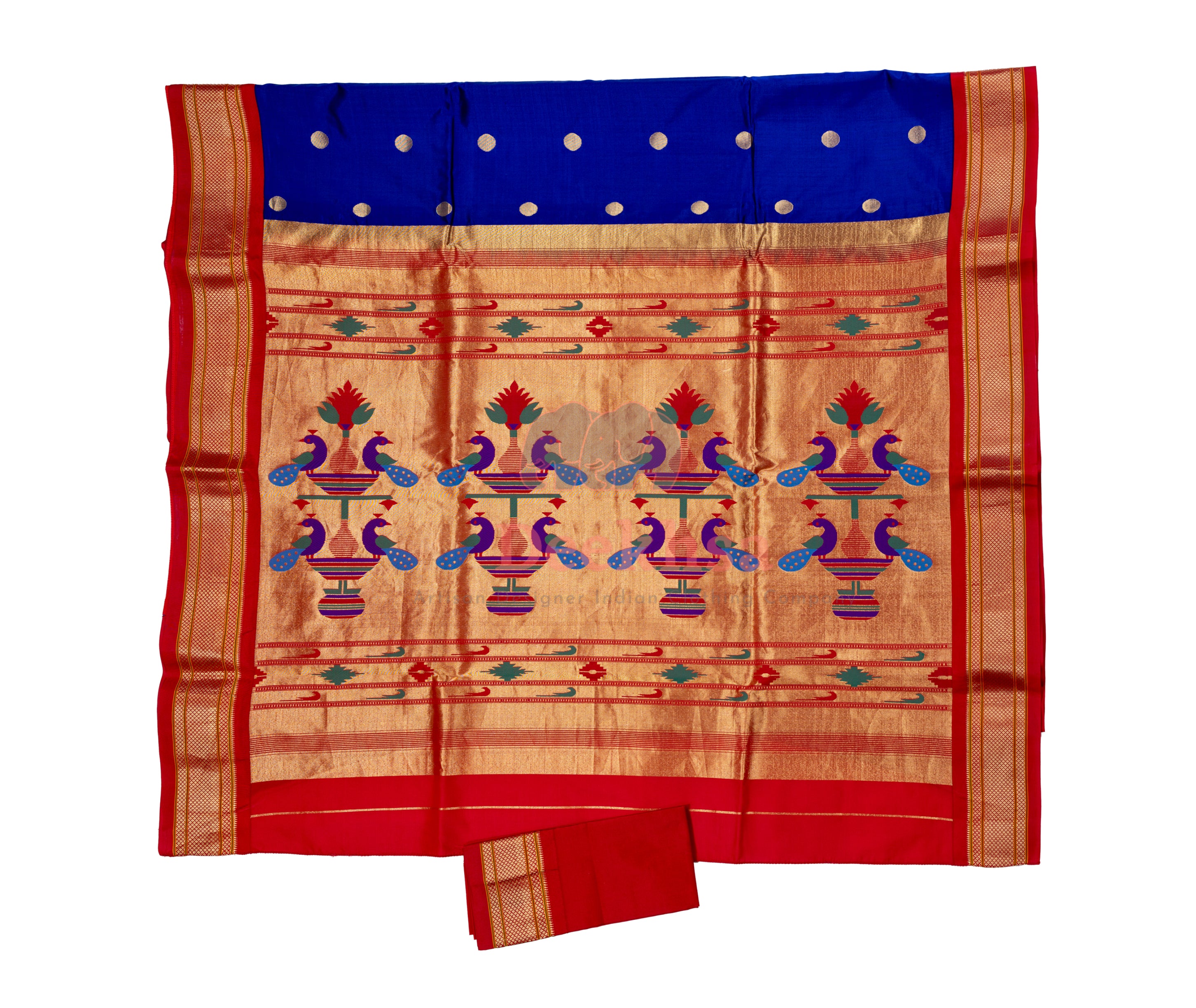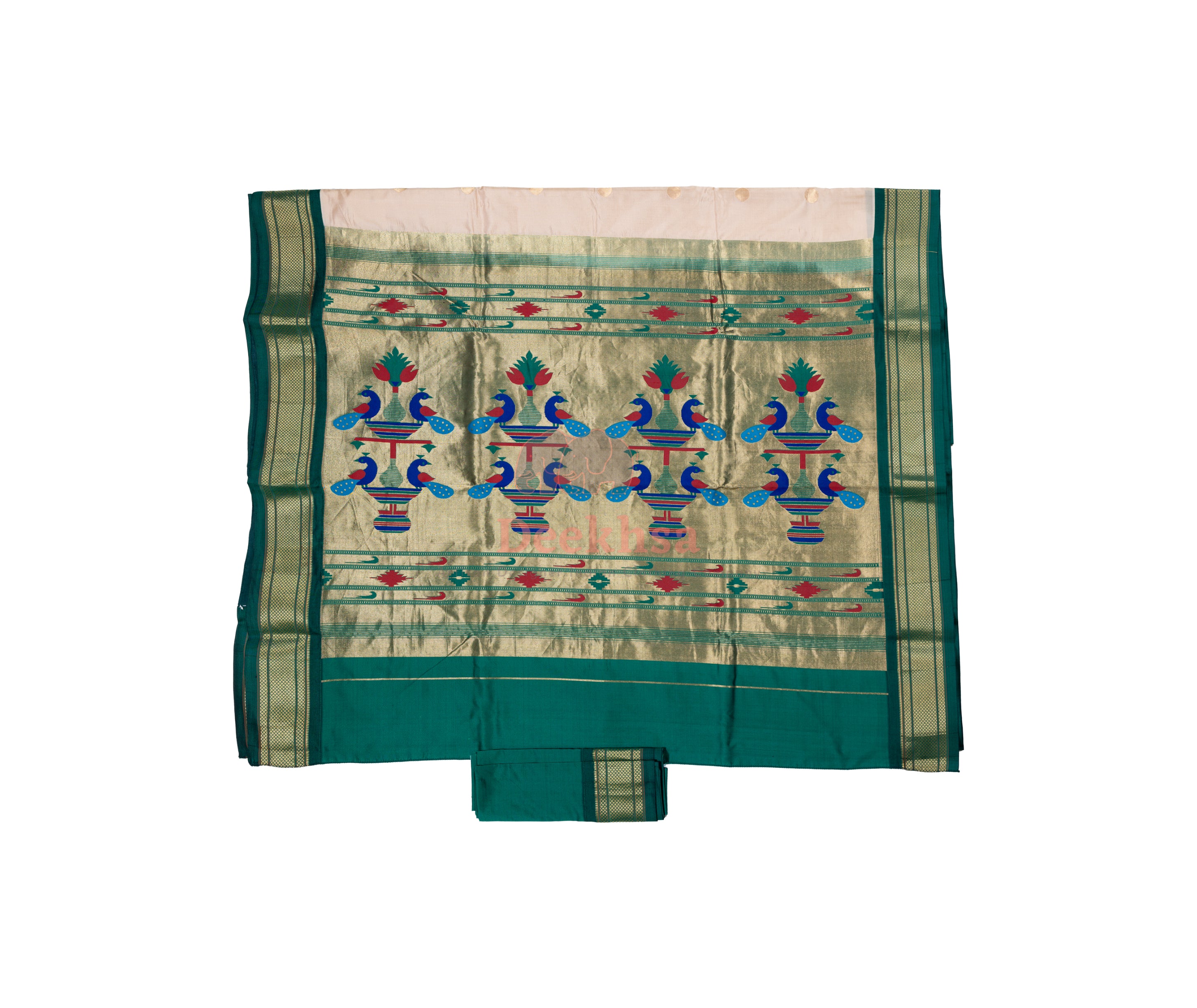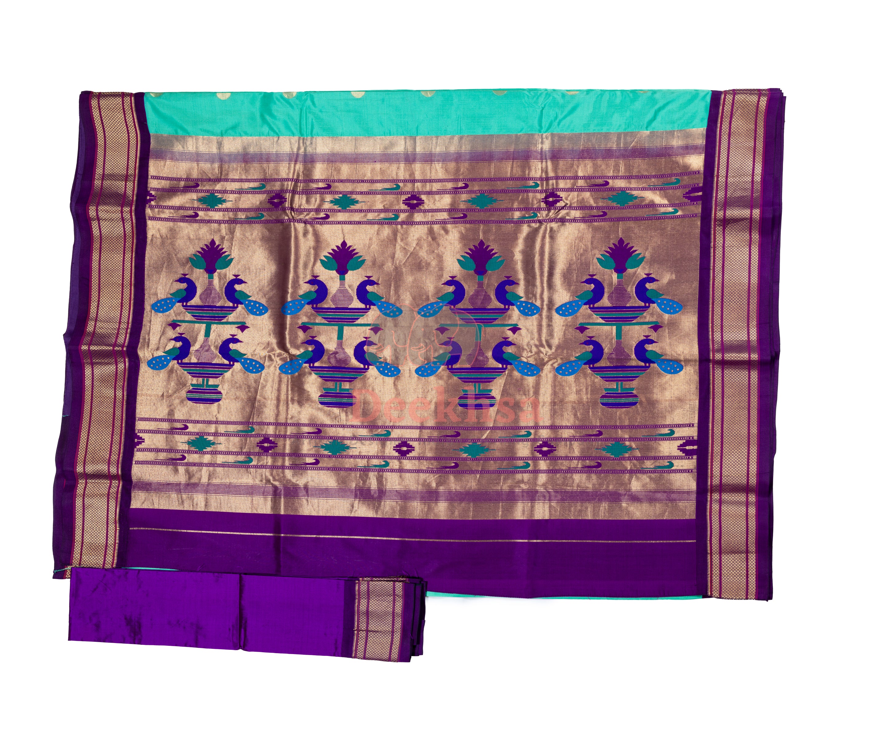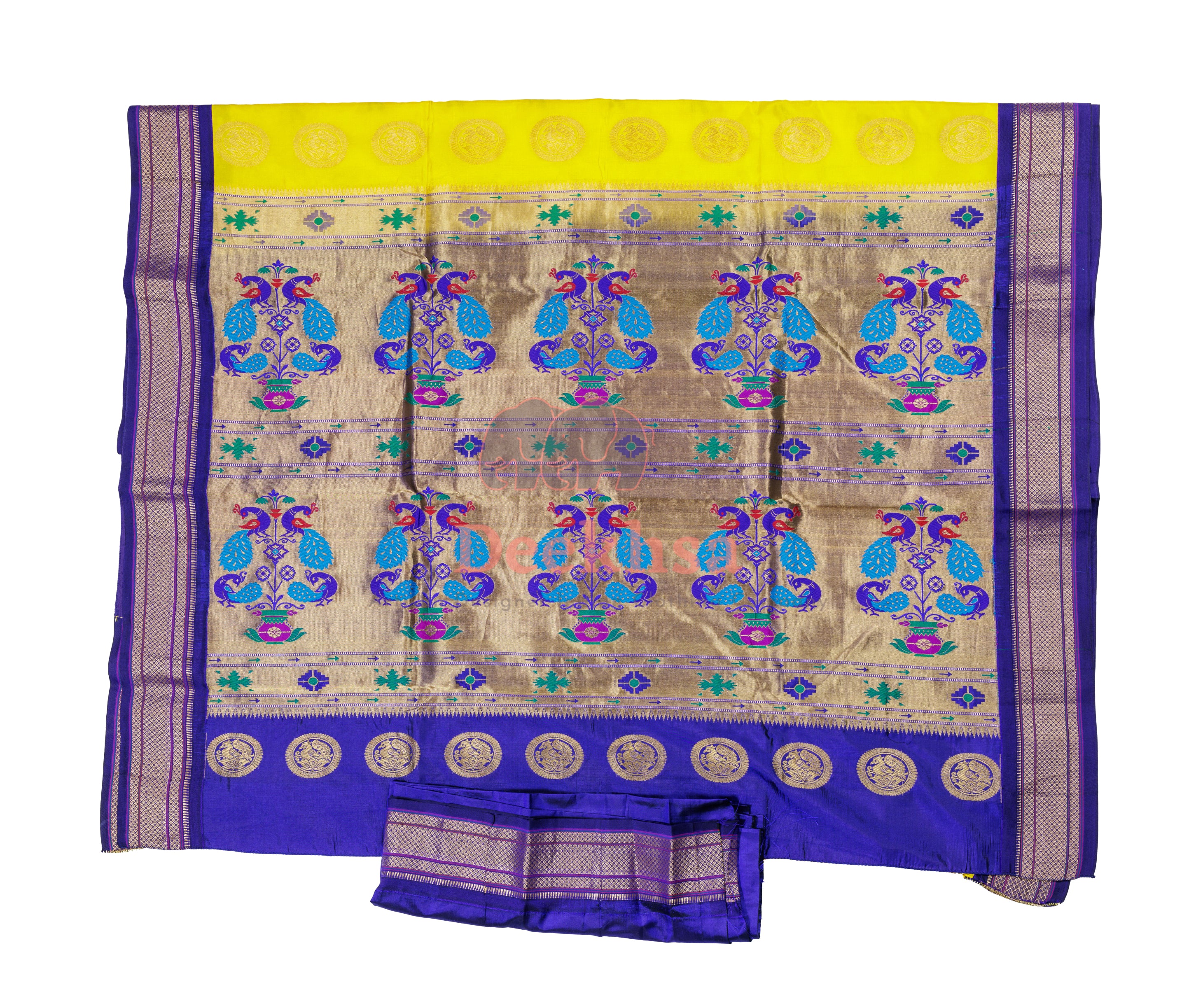 Featuring a classic handwoven body with signature Paithani borders and pallus, it comes with a matching blouse piece to complete the look.