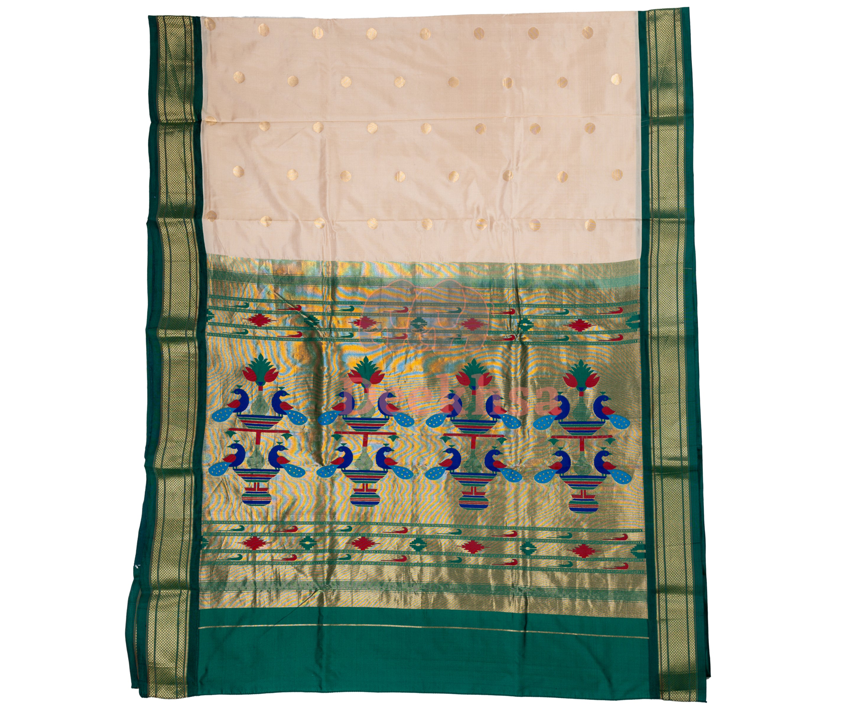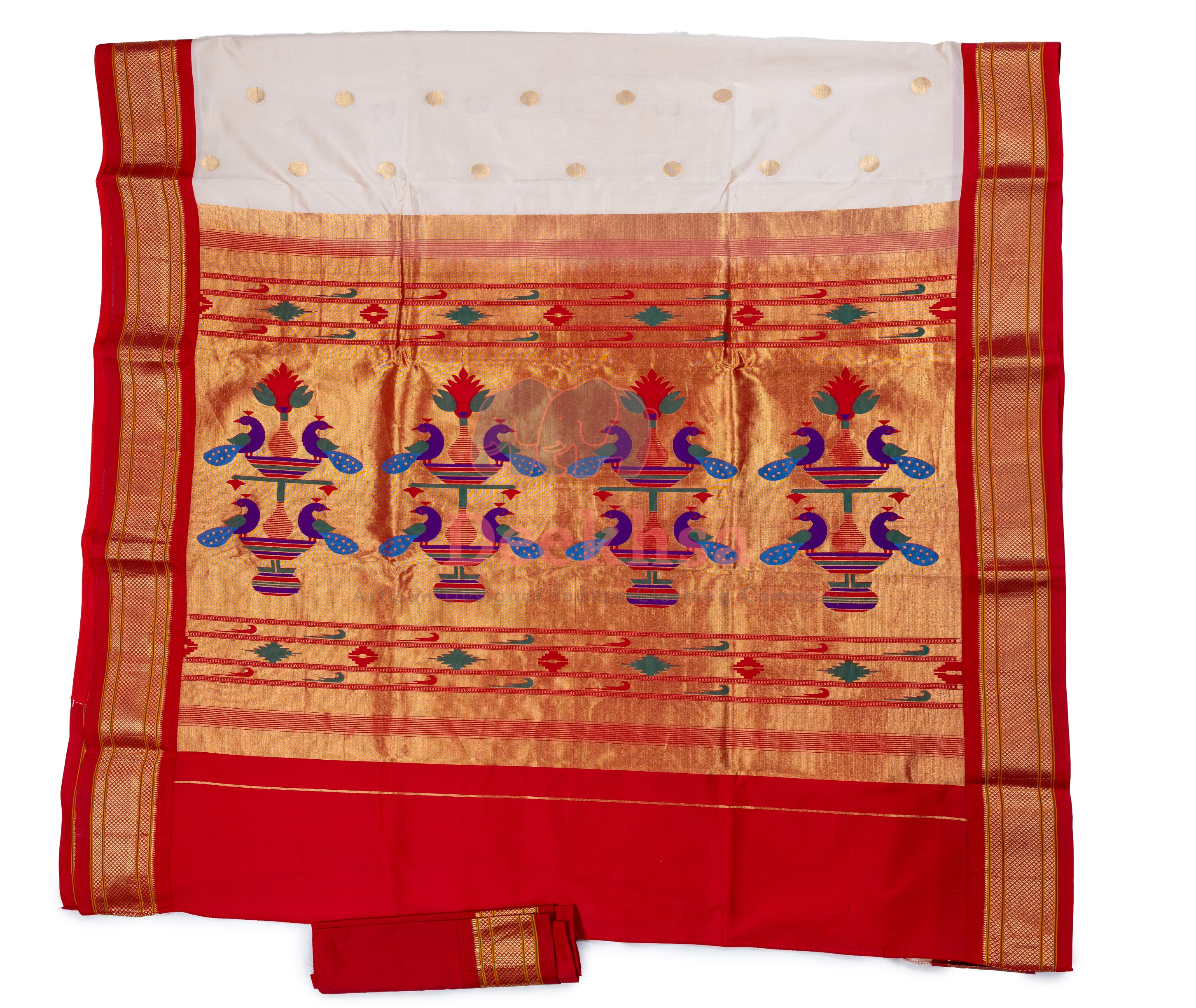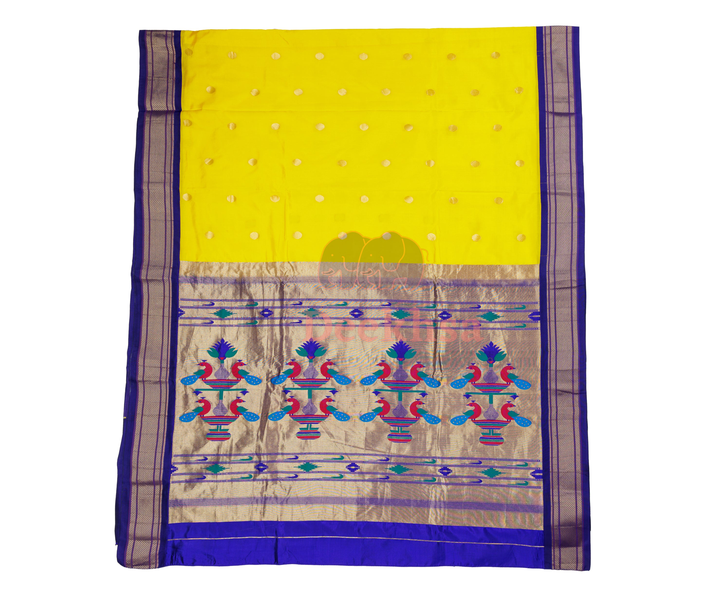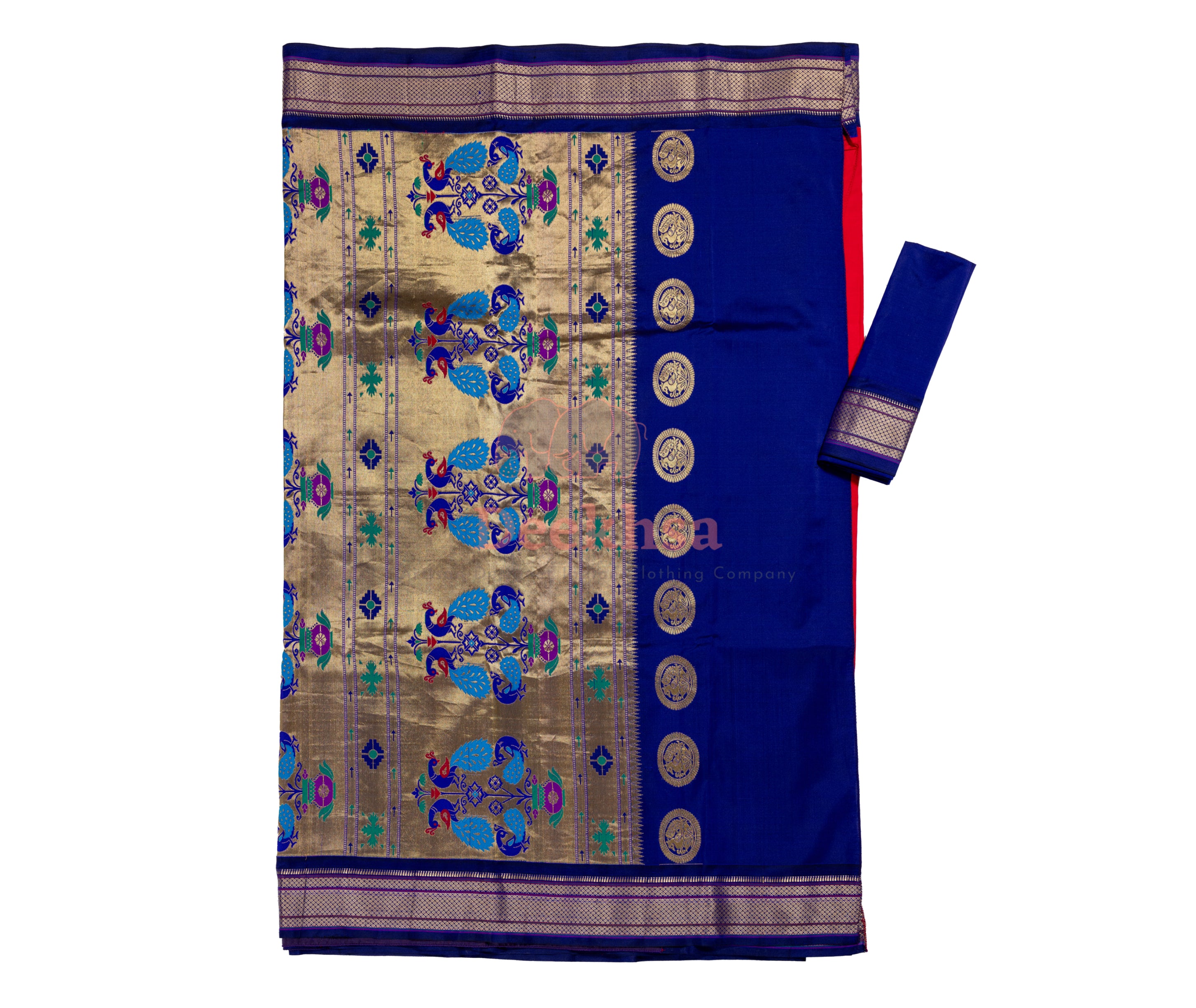 Featuring a classic handwoven body with signature Paithani borders and pallus, it comes with a matching blouse piece to complete the look.