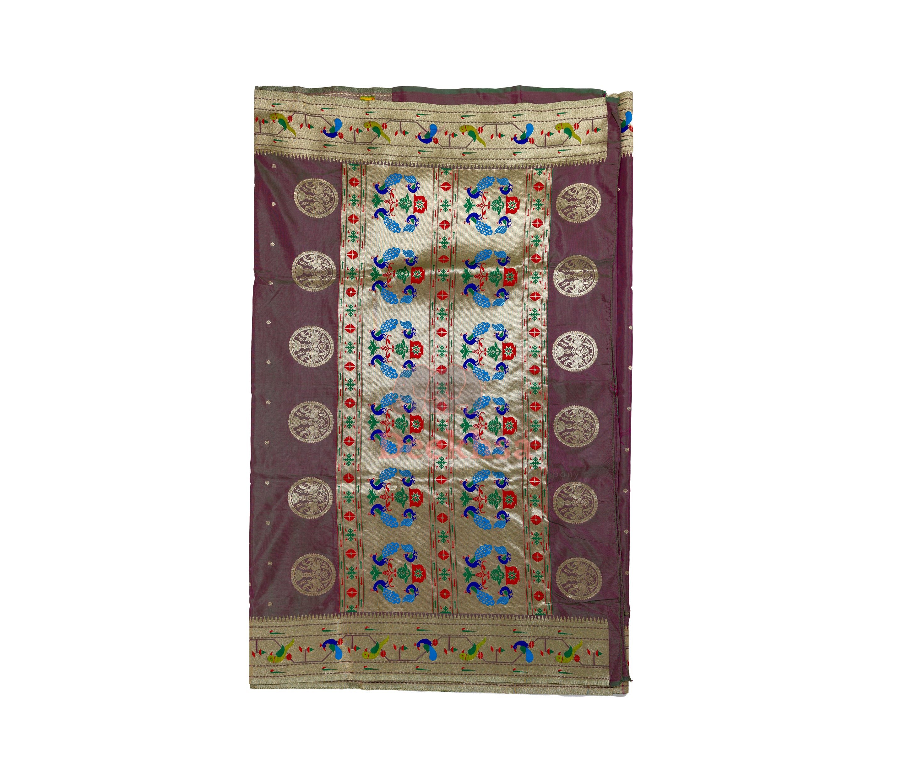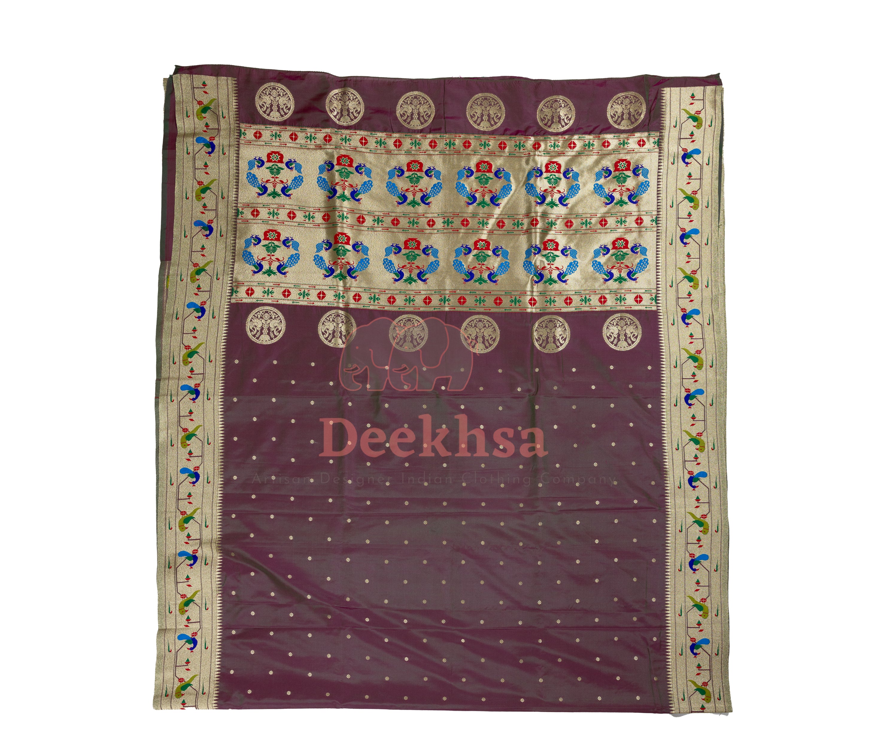 "Crafted from pure silk, this Ilkal Paithani saree beautifully blends the weaving traditions of Ilkal and Paithani, creating a masterpiece of vibrant artistry and intricate craftsmanship.